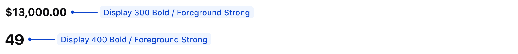 Use Display 300 Bold or Display 400 Bold (depending on existing content hierarchy) with Foreground / Strong when the value should be emphasized over the title. The callout style is often used for numerical content, like resources or financial data.
